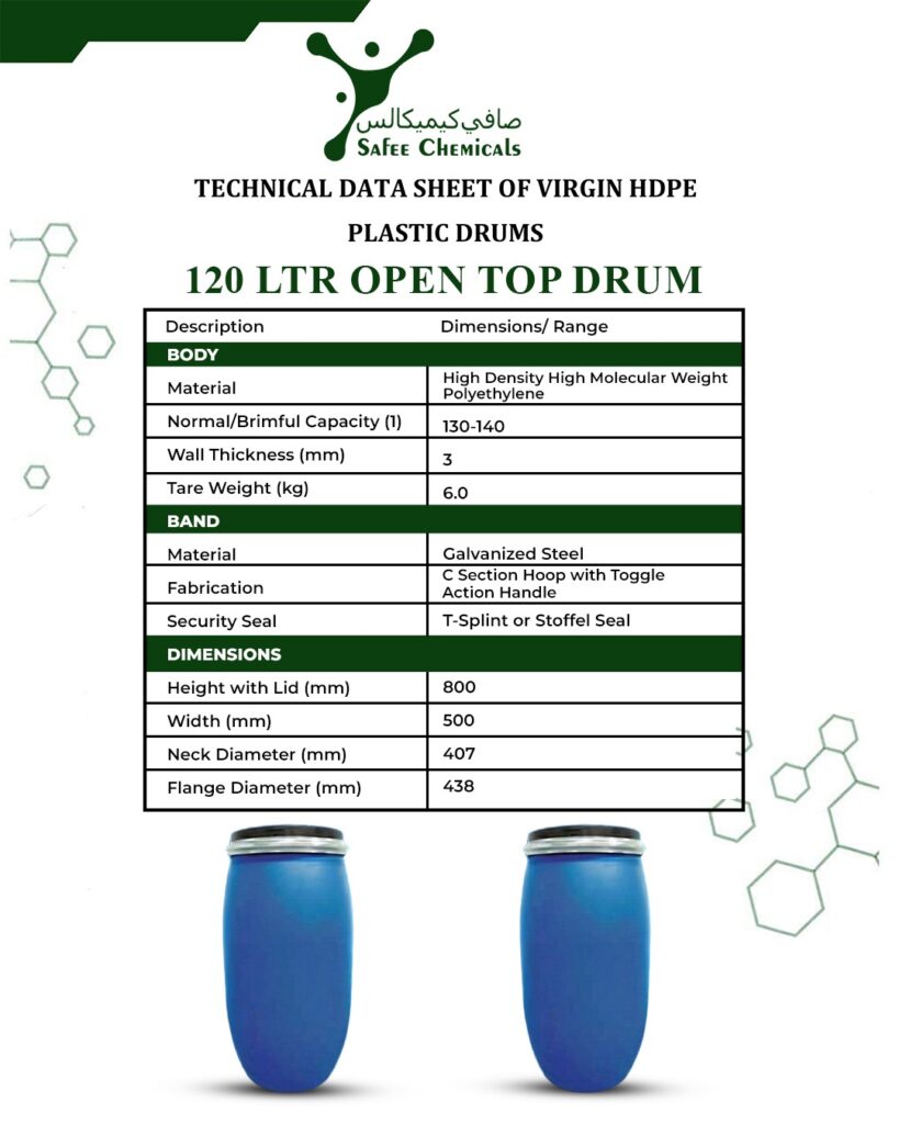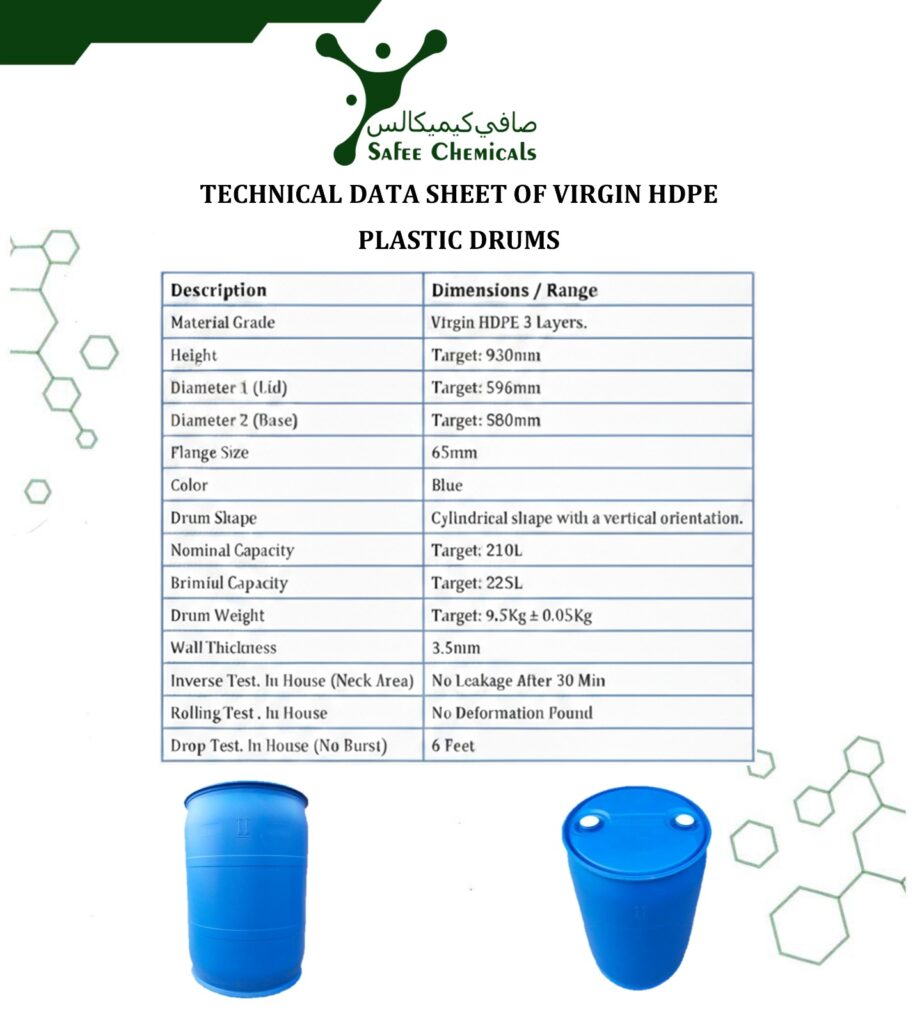 Safee Chemicals is a leading manufacturer of high-quality HDPE Plastic Drums, designed to meet the diverse packaging and storage needs of various industries. Our drums are produced using premium-grade High-Density Polyethylene (HDPE), ensuring superior strength, durability, and resistance to chemicals, impact, and environmental conditions.